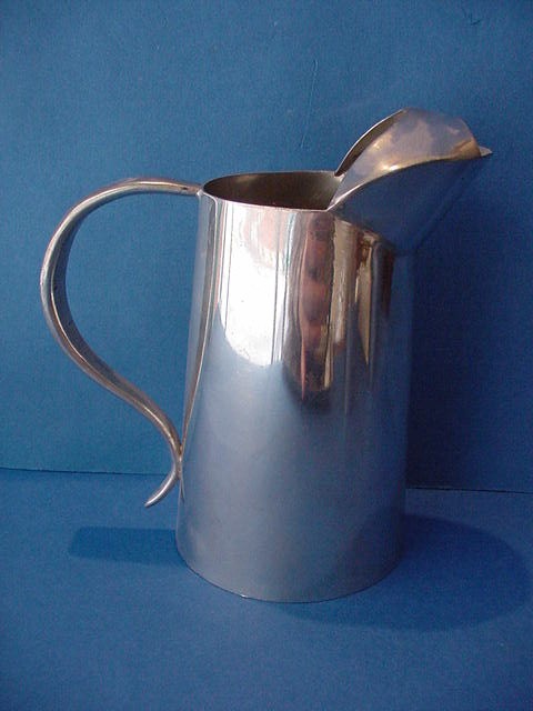 1297-06. American Arts & Crafts Pewter Bar Pitcher, Tray, 6 Tumblers & Jigger of rather simple form; hobby made and marked (J) by Lyman C. Josephs of Bel Air MD in 1960. No mono. Original signed typed presentation note to a Dr. Andrus. | Pitcher: 1.88" high, 6.25" long, 2.5 cup capacity; Tumbler: 2.75" high, 3.25" lip diameter, 1 cup capacity; Jigger: 2.38" high, 2.75" long, 2 oz. capacity; Tray: 11.5" long, 7.5" wide. | SOLD |