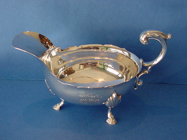 1543-37. American Silver Sauceboat, Stand & Ladle, the colonial reproduction Sauceboat with three cast hoof feet and cast flying double scroll handle, shaped oval Stand, and 'Hanovarian' pattern Gravy Ladle; handwrought by James A. Curtis, who trained and worked at Colonial Williamsburg for over 40 years (Apprentice 1965-1974, Journeyman 1974-1980, Master 1980-2005+). | Sauceboat: 4.5" high, 7.62" long, 3.88" wide, 9.8 troy oz.; Stand: 0.75" high, 9.25" wide, 6.62" wide, 9.9 troy oz.; Gravy Ladle: 7.75" long, 2.38" bowl diameter, 0.88" bowl depth, 2.45 troy oz.; troy oz. total weight. Script mono "WMF" for William F. Miller of Winchester VA. | SOLD |