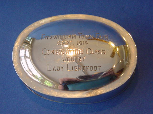 1573-19. American Silver Arts & Crafts Trophy Box of oval form with a slip-on domed cover and gilt interior; marked by Arthur J. Stone of Gardner MA and struck with the journeyman craftsman's mark of "P" probably for flatware specialist Walter W. Pfeiffer working 1914-1916 (the other possibly is Holloware specialist John H. Petty working 1906-1907). | 1.0" high, 3.38" long, 2.38" wide; 2.9 troy oz. The cover engraved presentation in small cap Roman letters "Fitzwilliam Town Fair Sept. 1914 Combination Class Won by Lady Lightfoot" commemorating the New Hamphire horse competition. | SOLD but lost by USPS in California! If seen please notify. |