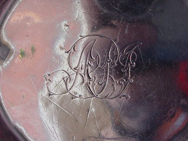 1572-53. American Silver Porringer of plain colonial revival form with scroll-pierced handle (#463); made by the Watson Co. of North Attleboro MA. | 1.95" high, 6.5"long, 4.75" lip diameter, 4.65 troy oz. Upper case block letter engraved "Elizabeth Prescott Martin" on the front side opposite the handle and script engraved "Frank K. Murphy March 20-1917" on the base. | $ 135. |