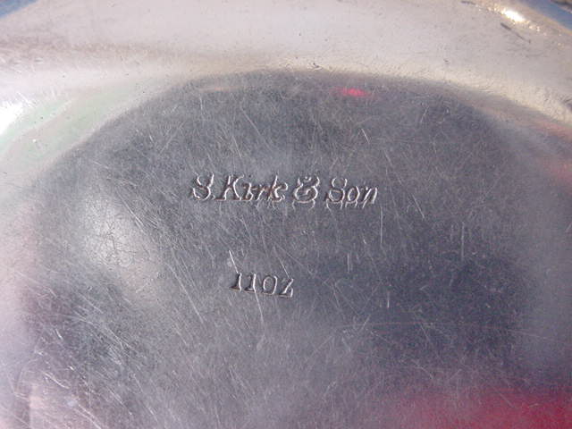 1536-16. Antique American Silver Youth Bowl & Spoon, the circular dish rim chased with floral decoration inside an applied foliate chased edge, the spoon handle hand-chased with floral decoration; made by S. Kirk & Son of Baltimore MD. Both pieces engraved with script mono "APJ"; the dish base with additional script presentation "Alan Pennimen Jones from Uncle Alan Sept 1882". | Dish: 0.75" high, 7.25" diameter; Spoon: 6.25" long, 1.3" bowl width; 7.8 troy oz. total. Some dings in the dish interior. | $ 320. |
