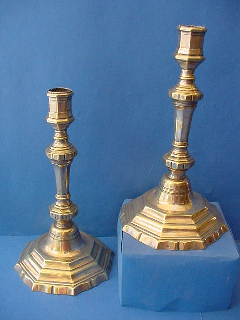 1555-49. Pair Antique French Brass Candlesticks in an 18th-century octagonal style with the shaft cast in halves and threaded into the domed and stepped shaped octagonal base; marked by Christofle et Cie of Paris, c.1844-1862. | 9.25" high, 5.5" base diameter. The original silvering surface wery worn, missing bobeches, one nozzle with hole. | $ 450. |