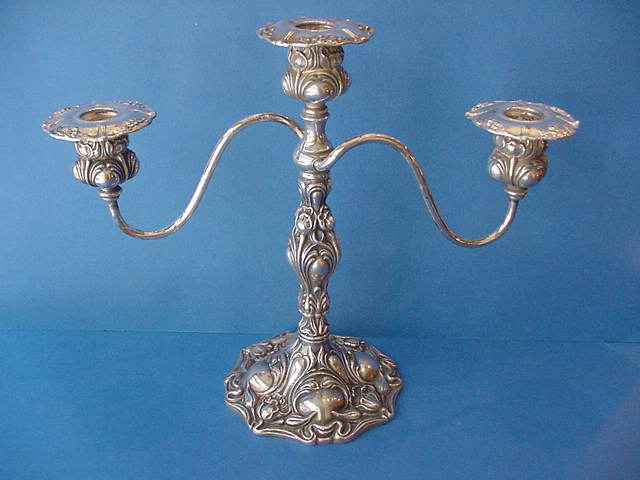1412-17. Pair American Silverplated Candelabra in a art nouveau floral design; marked Apollo, c.1895-1915. No mono. | 10.0" high, 12.75" long, 5.0" foot diameter. Losing a lacquered surface. | $ 325. |