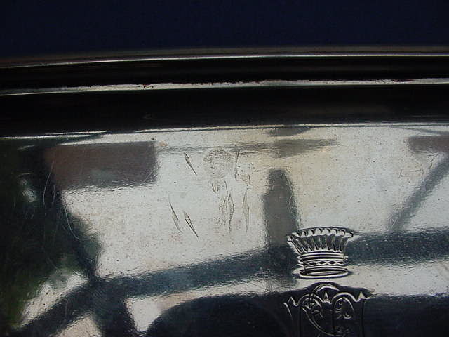 1562-35. Antique George IV Silver Snuffer Tray of hourglass form on four cast shell & scroll feet, the tray surface chased with floral & scroll repousse decoration inside the cast and chased floral and foliate scroll rim, cast and chased flying double scroll handle with foliate cap; marked by Thomas Burwash at London in 1821/22. | 2.75" high, 8.0" long, 3.75" deep, 10.65 troy oz. The original engraving replaced with crowned lion's head crest below a viscount's(?) coronet. | $ 1,500. |