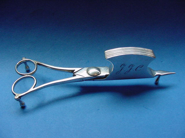 1316-55. Antique George III Silver & Steel Candle Snuffers, the engraved thread and scroll openwork handles attached to a shaped steel wick cutter with pointed end, three silver feet; marked by specialist maker Abstainando King at London in 1793/94. No mono. | 1.69" high, 6.25" long. One foot replaced; some splits to handle. | $ 350. |