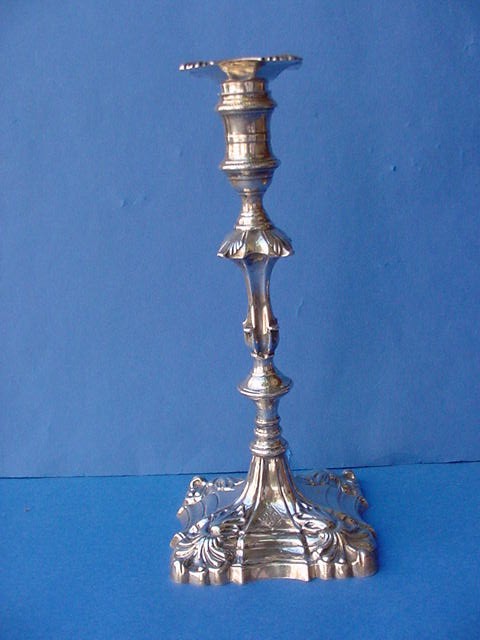 1541-47. Pair Antique George III Silver Candlesticks with shell- and gadroon-edged decorated cast shaft on shaped square cast bases with shells on the corners, unmarked detachable bobeche fitting into the nozzle; marked by John Cafe at London in 1771/72. Engraved with widow's armorial on the base and bobeche. | 10" high overall, 4.5" square base, 2.5" square bobeche, 37.8 troy oz. total. Repair to one shaft resulting in slight lean. Some surface wear. | STOLEN!! If seen please contact us. |