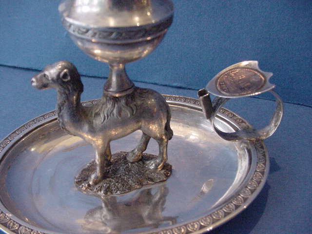 1542-50. Antique German Silver Chamberstick featuring a cast camel column on an oval dish with applied floral milled rim, the ring handle with shield thumbpiece applied with small 1773 Mideastern(?) copper coin; marked by the unidentified [BM] at Munich in 1822(?). | 3.3" high, 4.25" long, 3.0" wide, 4.4 troy oz.Socket on handle for missing extinguisher. | $ 550. |