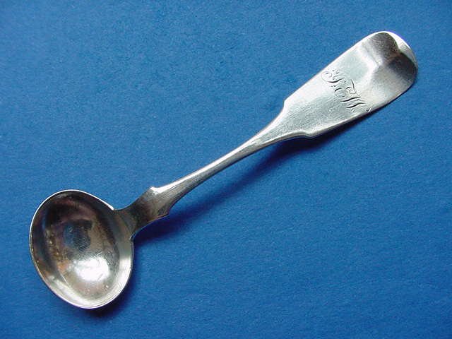 1448-51. Antique American Silver Salt Spoon in the 'Fiddle' pattern marked by Oliver B. Cooley of Utica NY, working 1828-1844. | 3.88" long, 0.88" bowl width. Engraved "W.A.Grant". | $ 28. |