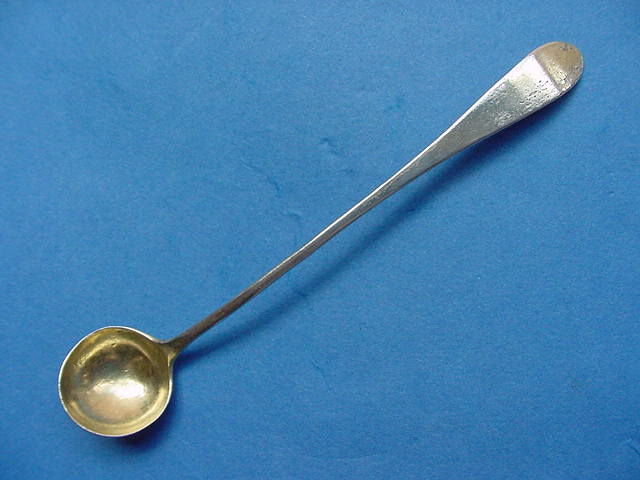 1483-07. Antique American Silver Mustard Spoon in the 'Antique' pattern marked by Robert Swan of Philadelphia PA, c.1790-1805. | 5.0" long, 0.88 bowl diameter. The original handle gilding is mostly worn away with some surface corrosion, bowl with new gilding. No mono. | $ 60. |