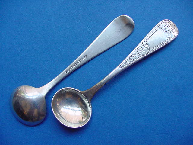 1347-21. Pair Antique American Silver Salt Spoons in the 'Antique' pattern; marked by Samuel Leonard of Chestertown MD, c.1810-1820. One script mono "W" and the other "M". | 3.55" long, 0.7" bowl width, 0.3 troy oz. Surface wear and discoloration, one thin bowl with major hole. | $ 125. |