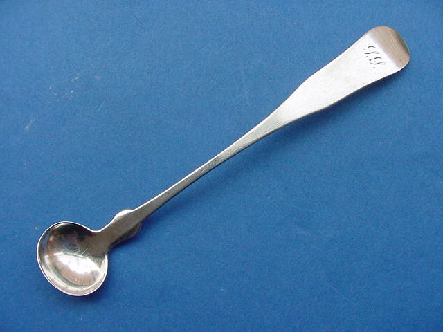 1027-07. Antique American Silver Salt Spoon in the 'Fiddle' pattern marked by William H. Whitlock of New York NY, w.1805-1827. | 3.75" long, 1.12" bowl width. Mono "CAO". | $ 20. |