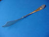 1556-47. Antique American Silver Butter Knife in an "Antique Engraved' pattern with floral engraved perpendicular curved blade; unmarked c.1860-1870. | 7.1" long, 0.88" blade width, 0.75" handle width, 0.75 troy oz. Some surface wear. No mono. | $ 35. |