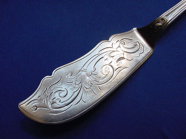 | 1535-06. Antique American Silver Fish Slice in a 'Knot' pattern with engraved foliate scroll and vine decorated blade; marked by Newell Harding & Co. of Boston MA, c.1850-1870. | 10.62" long, 2.5" blade width, 2.9 troy oz. Mono "M" within a wreath. | $ 195. | |