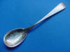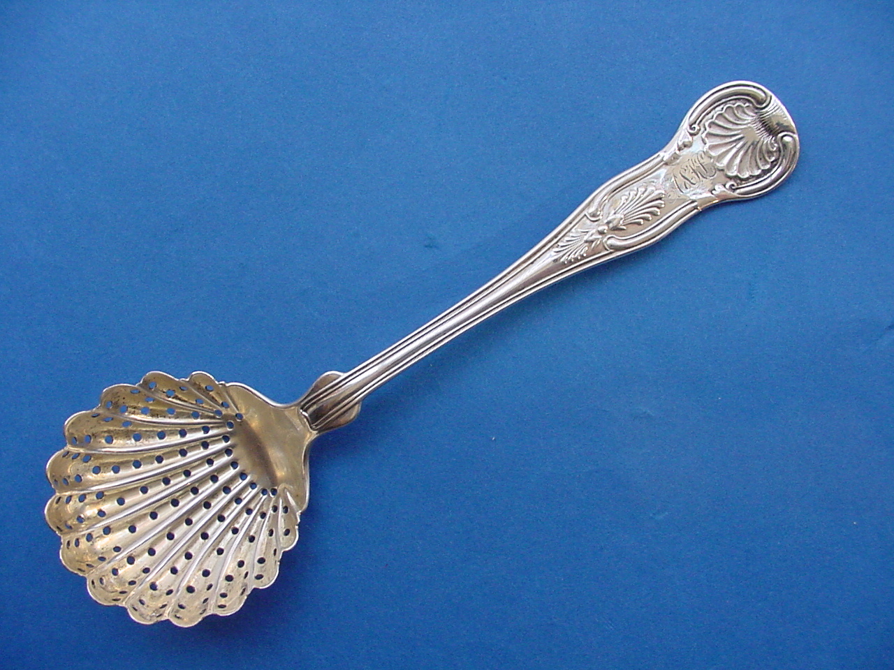 1596-81. Antique American Silver Sugar Sifter in the 'Wavy Fiddle' pattern with pierced oval bowl; marked BIGELOW, BROS & KENNARD for the Boston MA manufacturer working 1847-1869. | 6.1" long, 1.9" bowl width, 0.4" bowl depth, 0.95 troy oz. Script mono "C". | $45. |