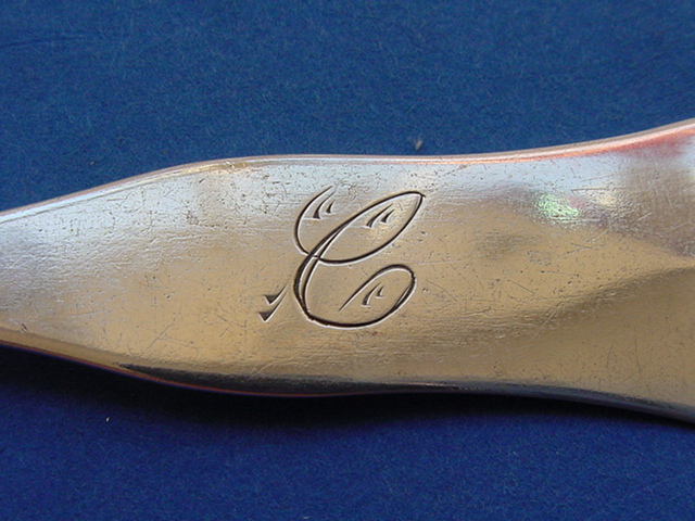 1454-08. Antique American Silver Butter Knife with the hollow handle in the 'Oval Thread' pattern ending in a short curved blade; made by Albert Coles of New York NY, c.1850-1875. | 7.18" long, 0.75" blade width, 1.25 troy oz. gross. Some dings including tip blade. Script mono "MSM" on the handle. | $ 25. |