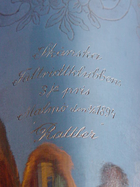 1564-46. Antique Swedish Silver Large Beaker of tapering and flaring horn form on a spreading swirl lobed gilt foot, a wide band of floral and scroll engraved decoration below the gilt lip, gilt interior; struck with maker's mark MORMAN by Anders Morman at Stockholm in 1790. Old(?) script mono "MOS:GED." on side and engraved script "EES" and "42 2" near marks on base. | 8.38" high, 6.38" lip diameter, 3.88" foot diameter, 17.5 troy oz. Later script presentation "Skanska Faltridtklubbens 3 je pris Malmo den 3/6 1894 Rattler" possibly for a horse or boat. Possibly old inscription erased prior to 1894 presentation. | $1,750. |