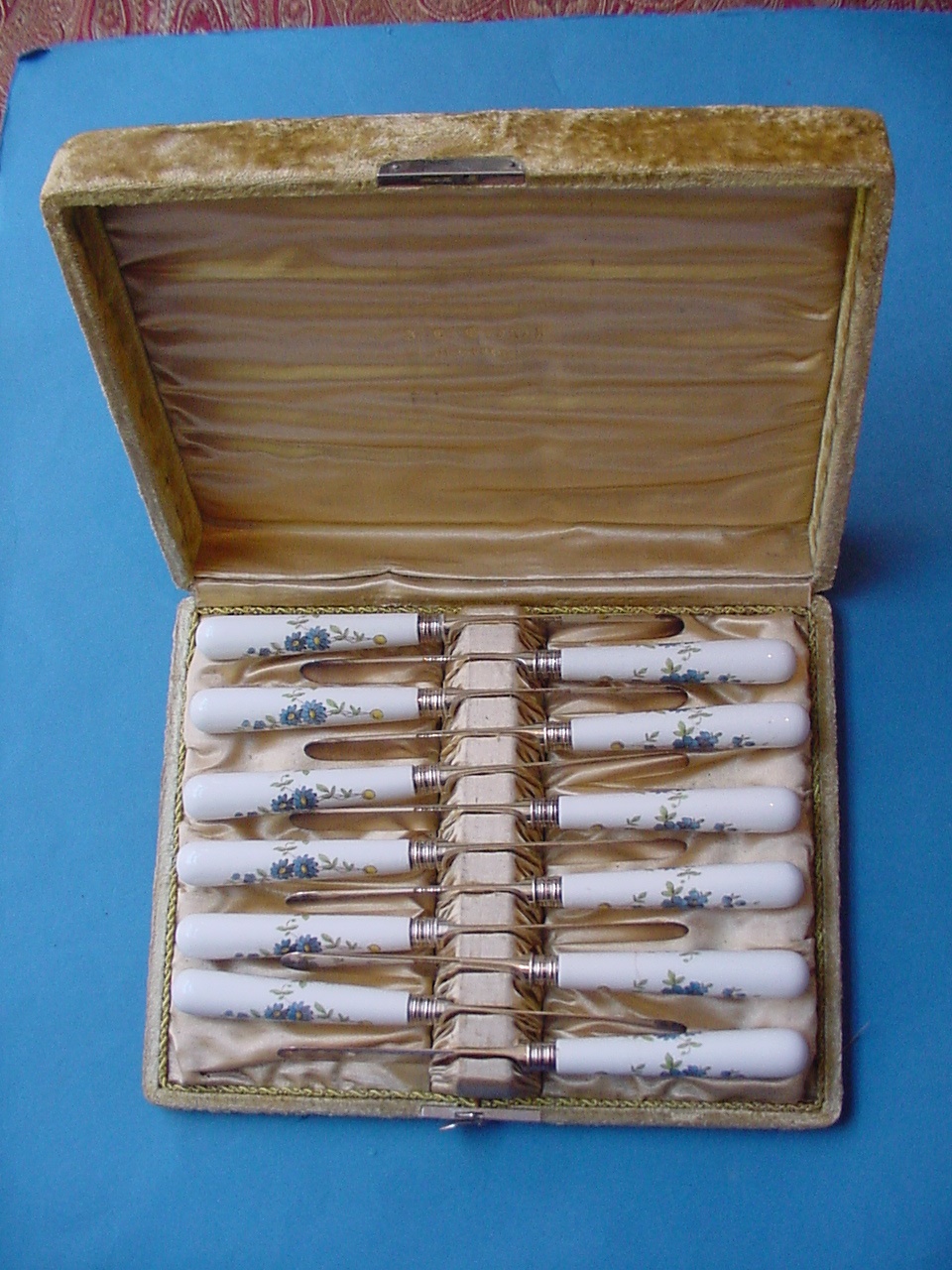 1337-24. 12 Edward VII Silverplate Fruit Knives with transfer printed porcelain handles and silverplate blunt blades; the blades marked by Harrison Bros. & Howson of Sheffield and contained in original green plush gift box labeled by J. C. Grogan of Pittsburgh PA. No mono. | 7.75" long. Three handles with small cracks and another with a wrap-around crack but otherwise no sign of use. These were given as a wedding present to Anna M. Milligan from Mr. & Mrs. E. M. Byers in October 1903. (Note lost.) | $ 350. |