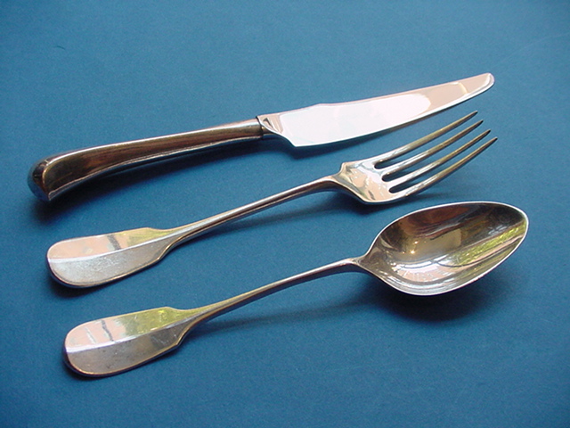 1579-61. 60 Piece Stieff 'Smithsonian' (1977) Flatware Service consisting of 12 Place Knives, 12 Place Forks, 12 Salad Forks, 12 Tea Spoons, 10 Dessert / Oval Soup Spoons, and 2 Fruit Knives with stainless blades (which could be used as Butter Knives); designed by Ronald Hayes Pearson, manufactured by the Stieff Co. and marked and presumably retailed by the Smithsonian Institution. No mono. Although the basic form is derived from the 18th century French 'Fiddle' pattern the designer gave it the look of a modernistic continental silver pattern. | Place Knives: 9.2" long; Place Forks: 7.6" long; Salad Forks: 6.65" long; Tea Spoons: 6.15" long; Dessert / Oval Soup Spoons: 7.15" long; Fruit Knives: 6.85" long; and weighable silver: 76.0 troy oz. | $2,250. |