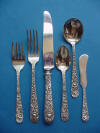1604-22. 36 Piece Kirk 'Repousse' Flatware Set consisting of 6 each Luncheon Forks, Luncheon Knives with stainless French blades, Salad Forks, Tea Spoons, Cream Soup Spoons, and Flat Butter Spreaders, c.1950-1980. No mono on plain back sides. | Luncheon Knives: 8.9" long; Luncheon Forks: 7.25" long; Salad Forks: 6.25" long; Tea Spoon: 5.9" long; Cream Soup Spoon: 6.05" long; Butter Spreader: 5.25" long; Weighable silver: 32.5 troy oz. | $1,100. |