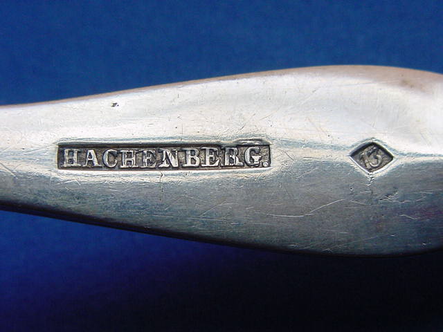 1548-51. Continental Silver Soup Ladle with turned wooden handle ending in a small ivory(?) cap, circular bowl; marked by the unlocated [HACHENBERG] with <13> quality mark, probably German c.1825-1850. Script mono "CEH". | 16.5" long, 8.0" wooden handle length, 3.62" bowl diameter, 1.4" bowl depth. | $ 150. |