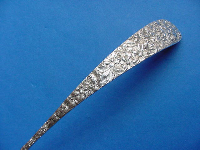 1566-62. Stieff 'Rose' Punch Ladle with douple-lipped oval bowl. No mono. | 14.5" long, 5.3" bowl width across lips, 2.85" bowl length, 1.05" bowl depth, 10.2 troy oz. | $ 700. |