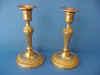 1410-34. Pair Antique French Gilt Bronze Candlesticks with foliate and bead decoration, the stems cast in halves and threaded into the base; unmarked c.1800-1830. No mono. | 7.0" high at detachable bobeche, 3.75" foot diameter, 2.12" bobeche diameter. One bobeche dented, nozzles with crack at solder joints, one stem bolted to base. | $ 625. |