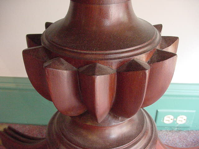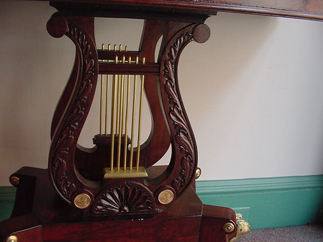 | 1546-36. Antique American Mahogany Card Table of classical form, the d-form book leaf hinged top rotating 90 degrees to open above the molded edge skirt supported by a exceptionally carved and brass stringed lyre pedestal mounted on four curved and carved klismos legs, gilt brass paw feet and small roundels; made in Philadelphia PA c.1815. | 29.5" high, 38" long, 19" deep. Four later larger mounted roundels (modern Presidential dollars!), veneer repair to right panel on top, several veneer and molding repairs. Will not ship; can deliver within a reasonable distance. | $ 8,500. | |