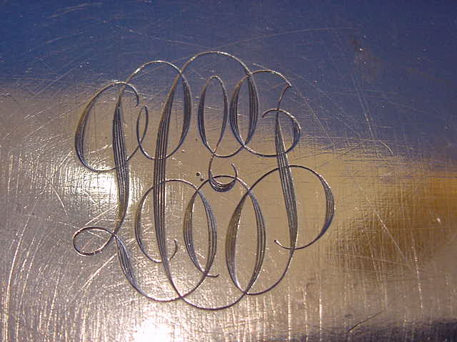 1486-57. Antique American Silver Bread Tray of oval form, the sides chased with floral repoussé decoration inside an applied floral edge, the interior engraved with diagonal bright cut diamond diaper decoration surrounding a floral wreath reserve with script mono "ETA" (#140); marked with the Baltimore Battle Monument trademark of A. Jacobi or A. Jacobi & Co. and retailed by Hennegan, Bates & Co. in Baltimore MD, c.1885-1895. | 1.38" high at ends, 14.25" long at rim, 8.5" wide at rim, 9.75" long at interior, 5.75" wide at interior, 16.5 troy oz. | SOLD |