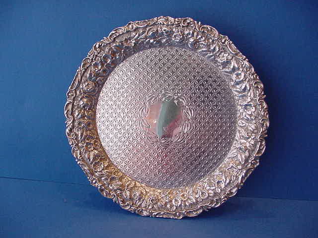1343-59. American Silver Large Waiter of circular form, the rim chased with floral repoussé decoration (#225); made by the Stieff Co. of Baltimore MD in 1951. Mono "HPF". | 16" diameter, 1.12" high, 45 troy oz. | SOLD |