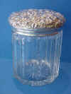 1472-29. American Silver-Lidded Glass Cracker Jar with the ten paneled jar with vertical fluted cut glass decoration, the mushroom form silver cover chased allover with repoussé floral decoration made by Jacobi & Jenkins of Baltimore MD, working 1896-1907. No mono. | Overall 6.5" high; Lid: 5.25" diameter, 4.7 troy oz.; Jar: 4.88" lip diameter. Some surface wear to the cover, several small chips at base. | SOLD |