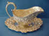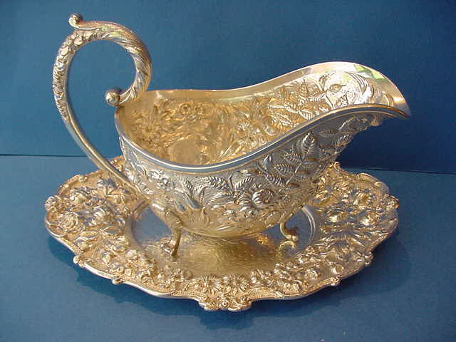 1472-30. American Silver Sauceboat & Tray of oval form, the helmet form sauce boat on three cast feet with chased floral repoussé decoration, the shaped oval tray with chased floral repoussé rim and engraved diagonal diaper surface; marked by Ritter & Sullivan of Baltimore MD, working 1900-1915. Mono "RGR" on sauce boat. | Sauce Boat: 5.25" high, 7.75" long, 3.75" wide, 10.0 troy oz.; Tray: 0.75" high, 8.75" long, 6.5" wide, 7.2 troy oz. |