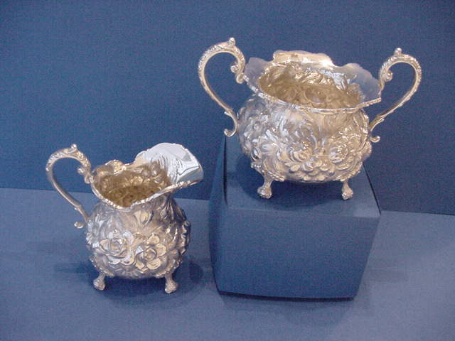 1332-32. American Silver Cream Pot & Sugar Bowl chased with floral repoussé decoration (#27); made by the Stieff Co. in 1929. No mono. | Cream pot is 4.25" high & long, sugar bowl is 4" high, 6" across handles, 13.4 troy oz. total. | SOLD |
