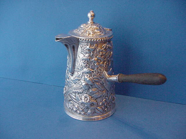 1337-31. American Silver Chocolate Pot chased with floral repoussé decoration and with turned wood side handle; marked sterling only but probably Baltimore MD, c.1880-1915. No mono. | 6.38" high, 7.5" long, 3.62" foot diameter, holds 1 pint, 13.5 troy oz. | SOLD | |