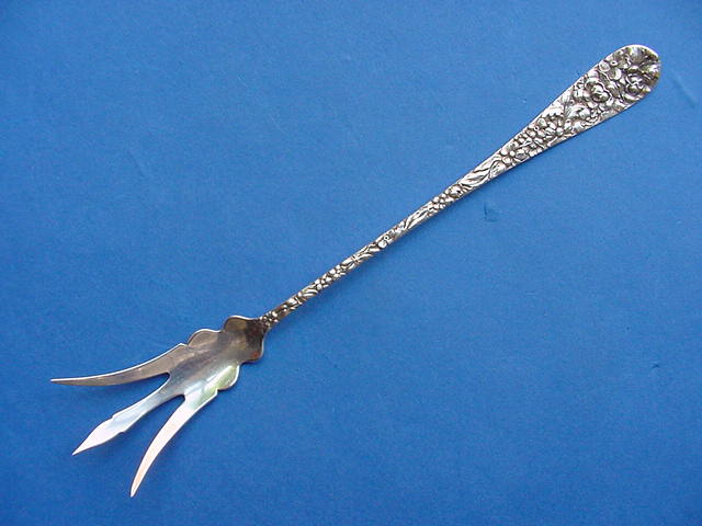 1569-02. Stieff 'Chrysanthemum' Long Olive Fork with two barbed tines; unmarked but made by the predecessor firm Baltimore Sterling Silver Co. c.1900-1905. Script mono "H". | 8.62" long, 1.5 troy oz. | $ 135. |