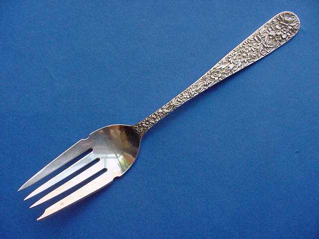 1568-13. Stieff 'Forget-me-not' Medium Cold Meat Fork (1910) with four flat tines. | 8.62" long, 1.6" wide across tines, 2.65 troy oz. Mono erased. | $ 125. |