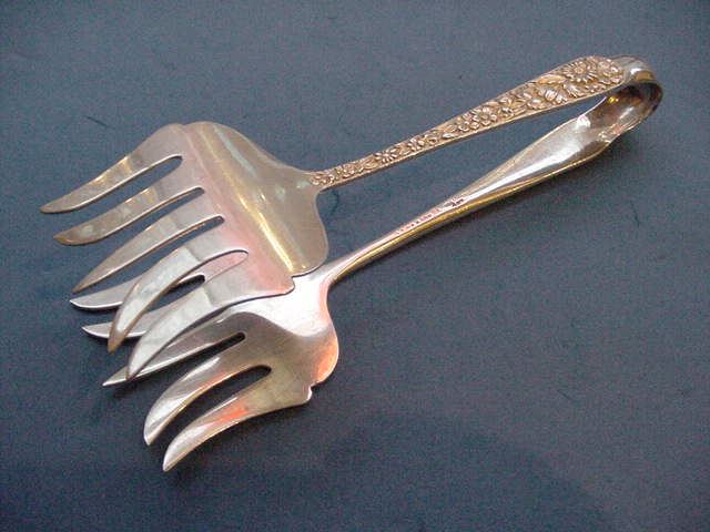 1556-39. Gorham 'Chantilly' Salad Serving Fork (1895) with piercing above the three tines. No mono. | 8.75" long, 2.3" wide across tines, 3.2 troy oz. | $ 150. |