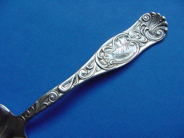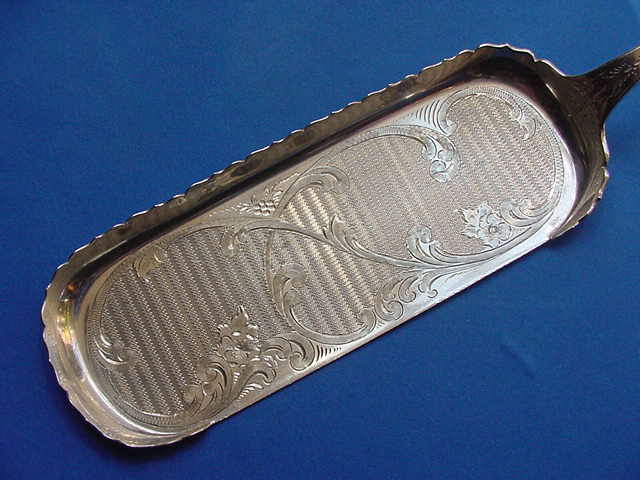 1544-60. Whiting 'Fancy Tip' Dessert Server (1874) with engraved symmetrical blade; retailed by Gaven Spence of Newark NJ. No mono, possibly erased. | 8.61" long, 2.62" blade width, 2.1 troy oz. | $ 135. |