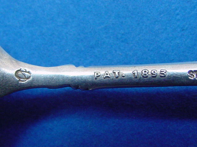 1575-33. Antique American Silver Souvenir Spoon decorated with a portrait of "Christopher Columbus" on the front of the handle and a view of the Santa Maria on the back, the bowl depicting the explorer and his men sighting the new world in "1492"; the design patented by William H. Thurber on 28 July 1891 (#20,971) and manufactured for the Tilden-Thurber Co. by the Howard Sterling Co., both of Providence RI. No mono. | 6.0" long, 1.25" bowl width, 1.05 troy oz. | $ 75. |