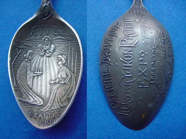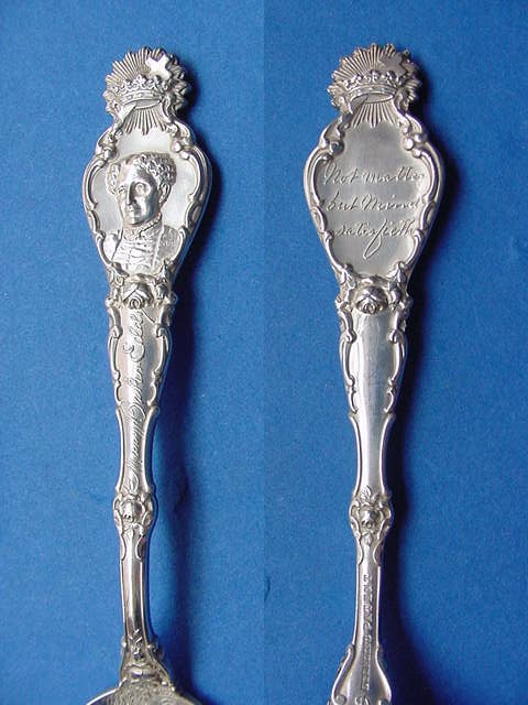 The collecting of Souvenir Spoons became popular in Europe during the second half of the nineteenth century. The first American Souvenir Spoons date from the 1880s but the collecting of them took off with the introduction of the Salem Witch Spoons by Daniel Low in 1891; great quantities of souvenir spoons celebrating historical and current events, people, and locations were made in the following decades. This page will have American examples categorized under Exhibitions & Fairs(by date), Historical Events (military & etc by date), Locations (alphabetical by state / town / buildings), People (alphabetical), and Miscellaneous; certain pieces may be listed under multiple categories. Most non-American examples will be listed by country under the continent but certain countries such as Britain, Canada and Mexico may have seperate categories.